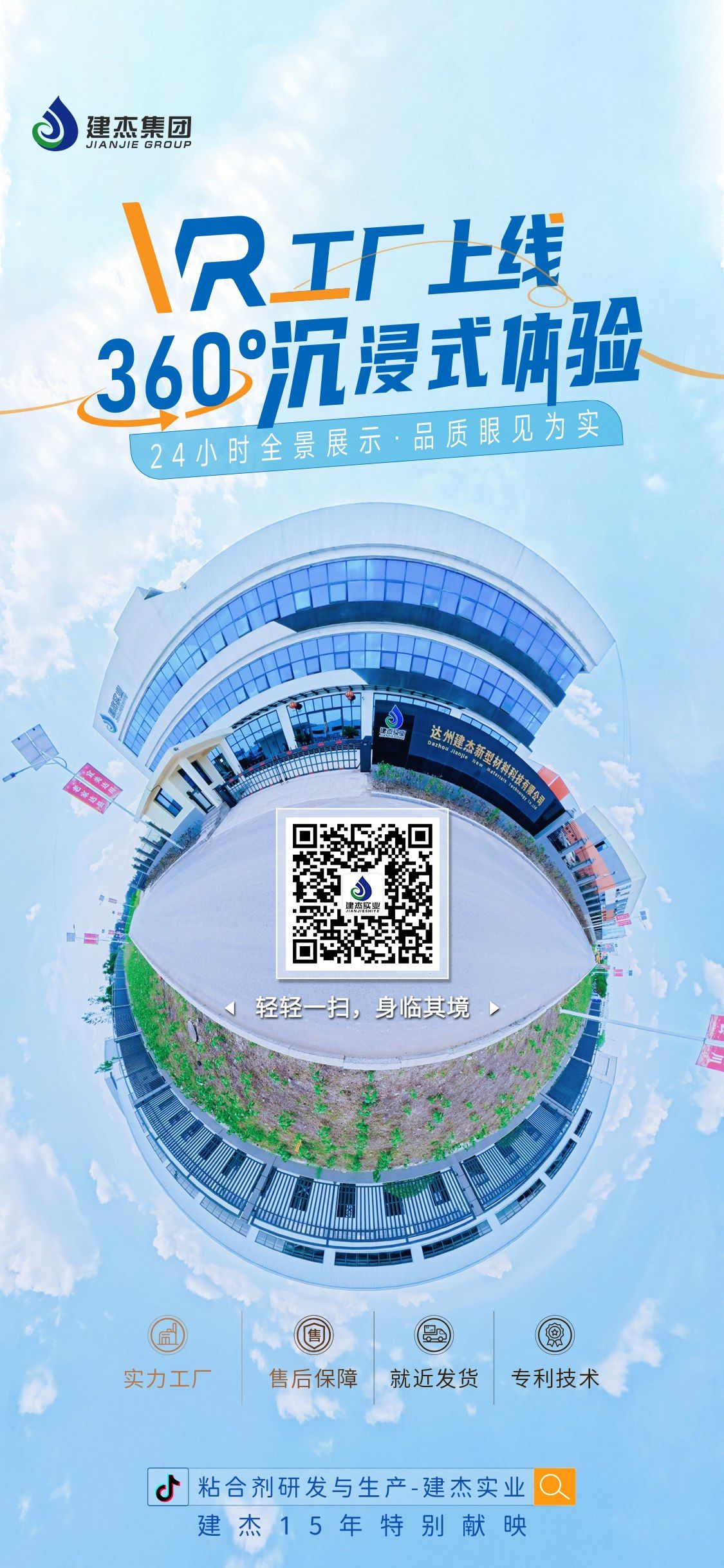 建杰15*典之际,建杰线上 vr 展厅重磅上线,访客360°沉浸式参观达州厂区的自动生产线,足不出户,就能感受到建杰粘合剂的生产全流程。